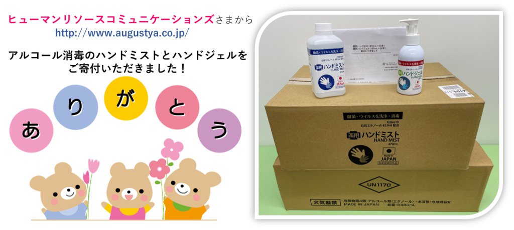 ヒューマンリソースコミュニケーションズさまから、アルコール消毒のハンドミストとハンドジェルをご寄付いただきました。大変ありがとうございます。発熱外来で毎日大量にアルコールを消費し不足する中、大変ありがたく、感謝いたします!